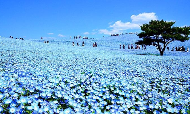 【國營日立海濱公園(常陸粉蝶花)】(National Hitachi Seaside Park) 地理位置鄰近太平洋,一年四季各有其不同面貌,園內花卉種類豐富,單單春天就可賞梅花、櫻花、杜鵑、鬱金香等等,每年粉蝶花滿開日期約在四月下旬到五月份,櫻花季謝幕後沒多久,接著夢幻粉蝶花登場,日本作家所寫《死ぬまでに行きたい!世界の絶景》(拚死也要去的世界絕景),宛若成千上萬隻美麗的蝴蝶繽紛飛舞,大地與藍天將染上優雅的紫羅蘭色彩,碧藍色的天空與花海連成一色,相當夢幻動人。 【袋田瀑布】(Fukuroda Falls) 瀑布位於茨城縣大子町袋田,為久慈川(Kuji River)支流瀧川(Taki River)上流,與華嚴瀑布(栃木)、那智瀑布(和歌山)並稱為「日本三大瀑布」。瀑布高120公尺、寬73公尺,瀑布之美在於有如片片水簾,又似絲絹的水流,由百餘公尺飛奔而下。春之新綠、夏之涼味、秋之楓葉、冬之水瀑,四季各呈現孑然不同的風貌,無論任何季節,都可享受到它的雄偉壯麗。瀑布享有「四度瀑布」別名,據傳因為瀑布分為四段飛瀉而下得名;另有一說,平安時代的西行法師(Saigyo Hoshi)稱讚「如果沒有每個季節各來訪一次,便無法感覺瀑布之美」。平成2年(1990年)曾入選「日本瀑布百選」第一名。